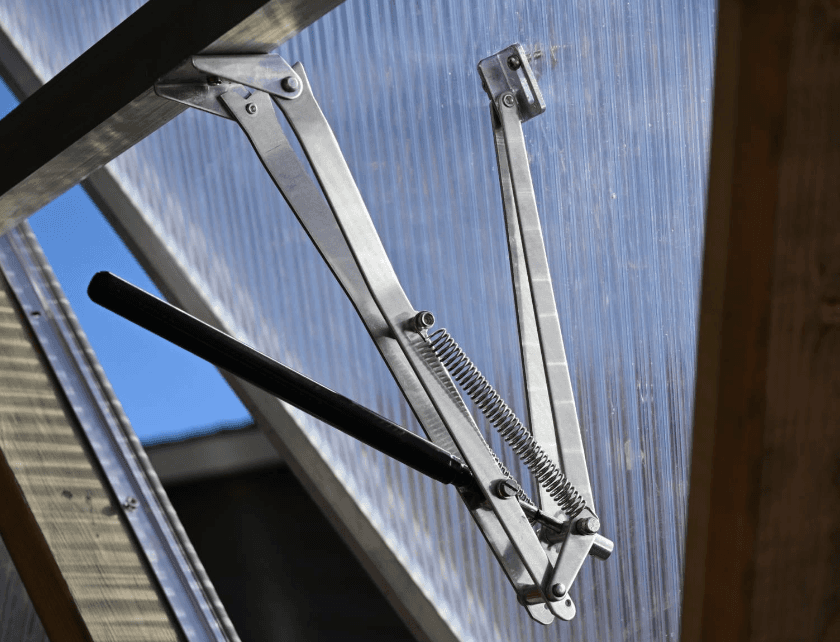 An automatic vent opener for a greenhouse regulates temperature by automatically opening and closing vents, ensuring optimal airflow and consistent climate control. It enhances energy efficiency, reduces manual adjustments, and helps prevent overheating, promoting healthy plant growth.