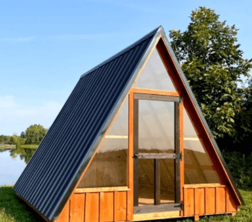 An A-frame roofline features a distinctive triangular shape with steeply pitched sides that extend to the ground. This design provides excellent snow and water runoff, a spacious interior, and a distinctive, dramatic appearance.